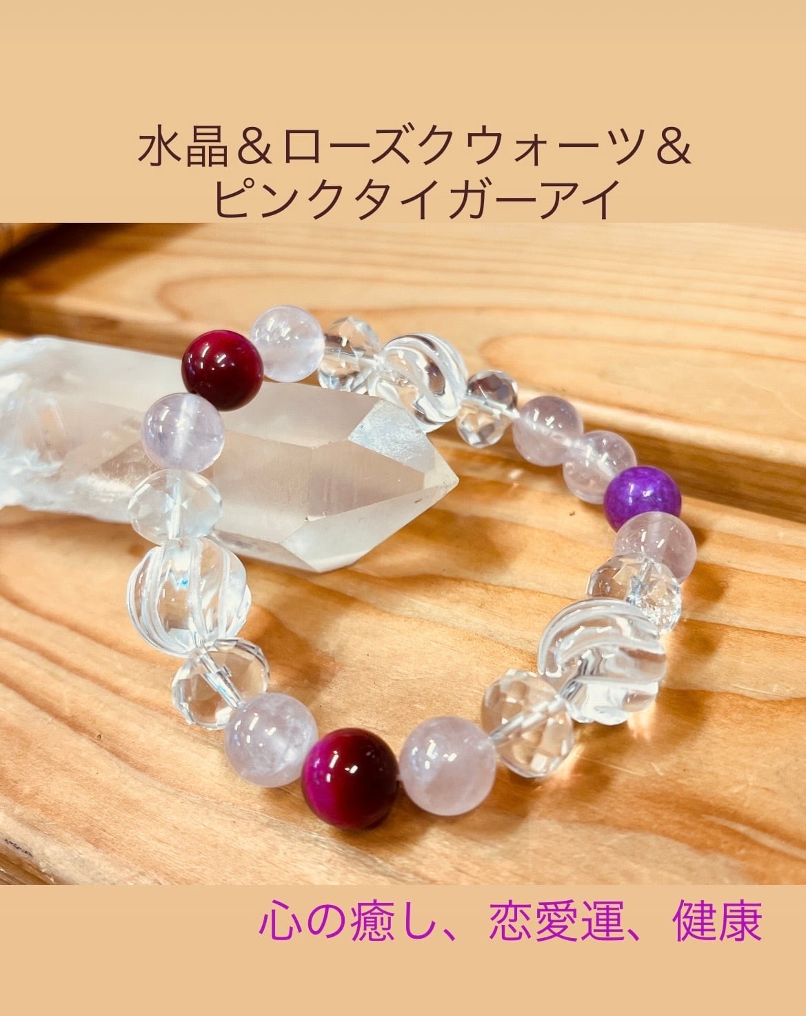 ローズクウォーツ、ピンクタイガーアイ、水晶のブレスレットです。