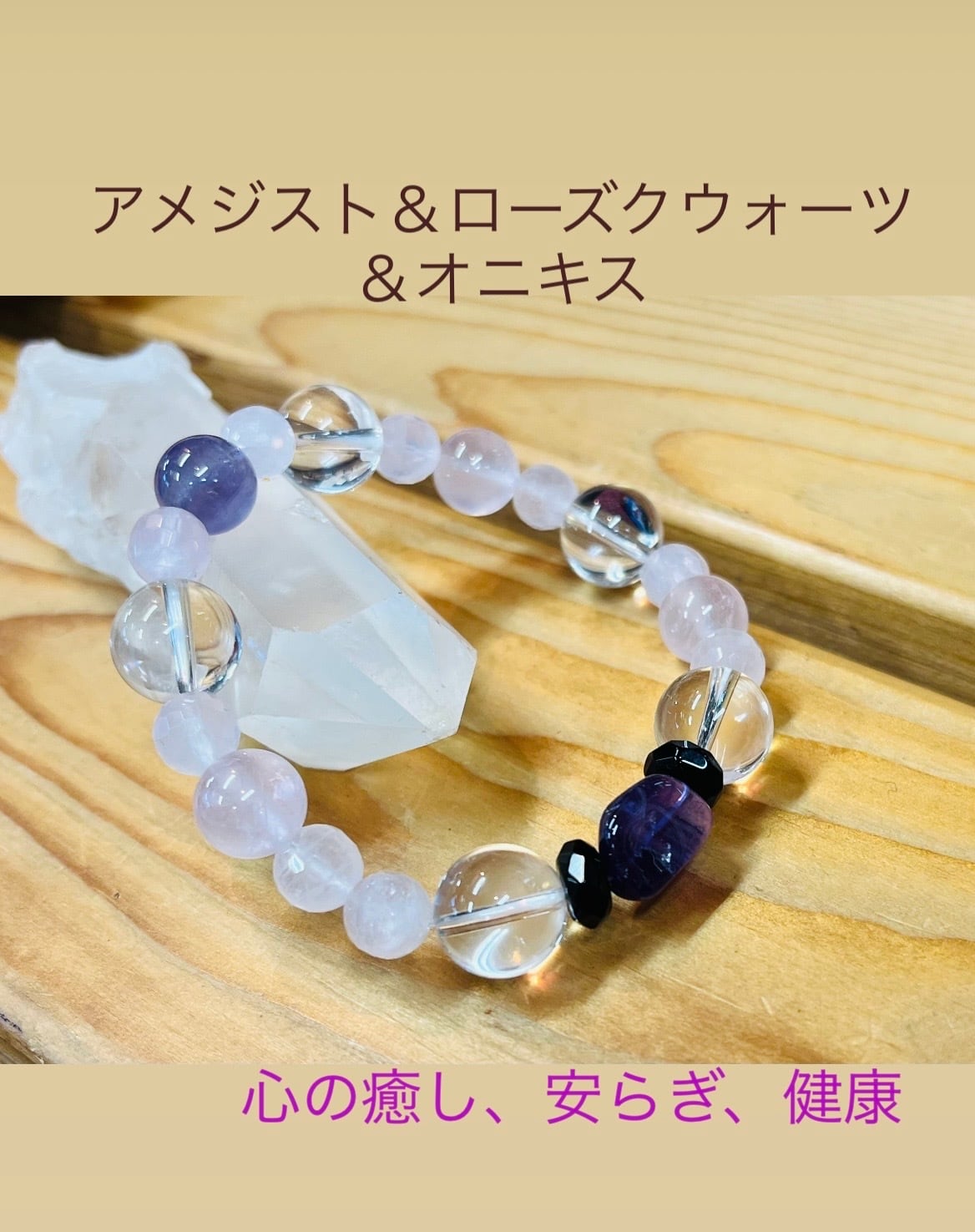 アメジスト、ローズクウォーツ、オニキス、水晶のブレスレットです。
