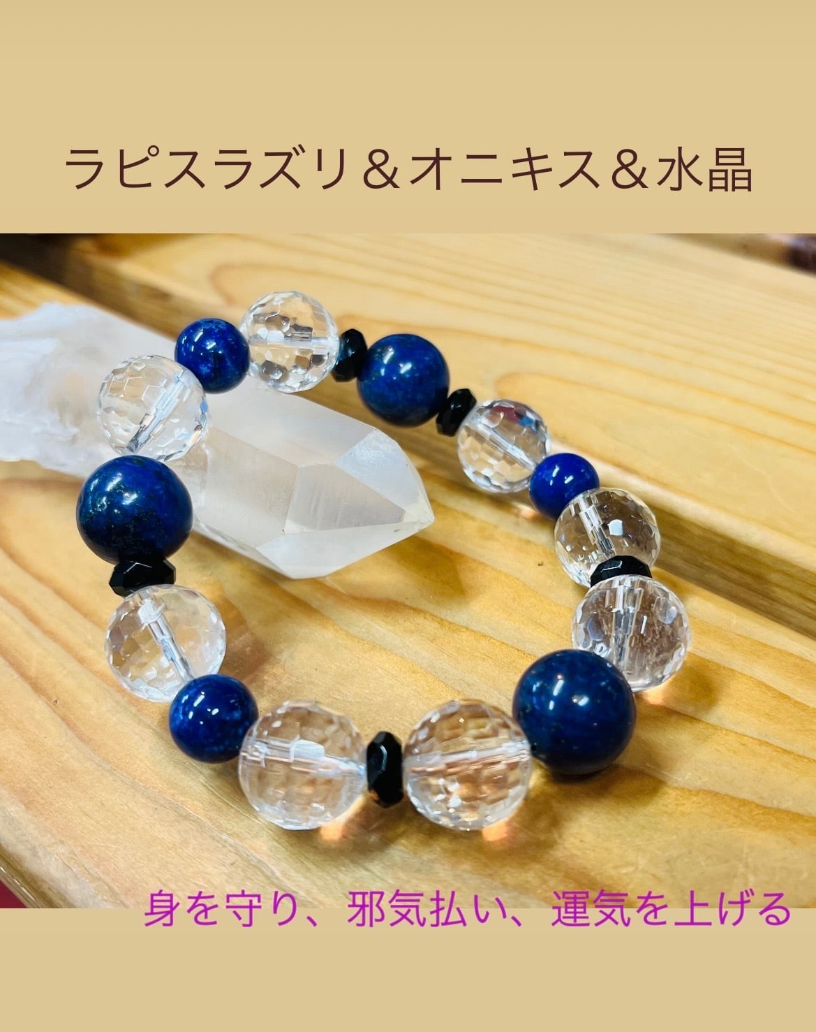 ラピスラズリ、オニキス、水晶のブレスレットです。