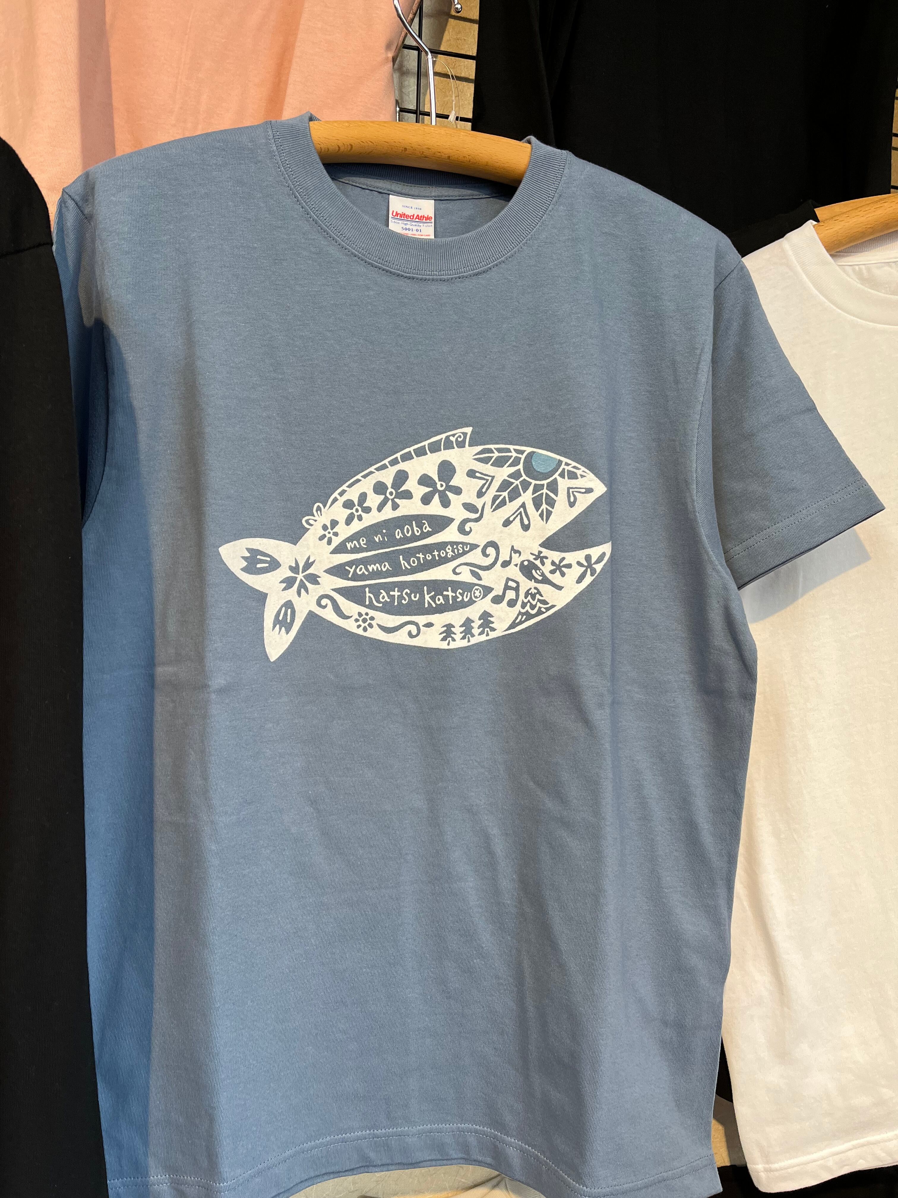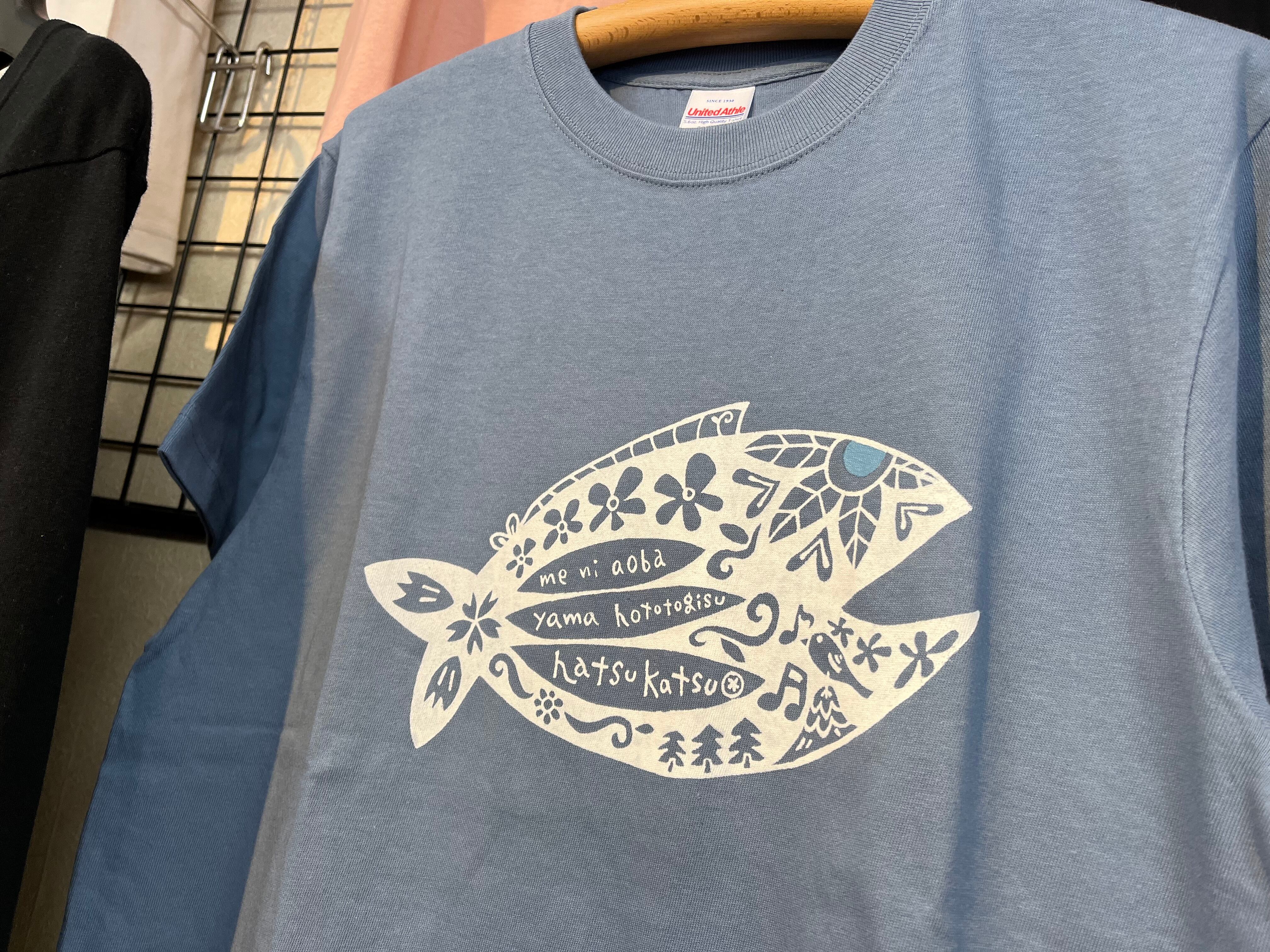 くすんだ感じのブルー系のTシャツに初鰹のデザインをプリントしました。